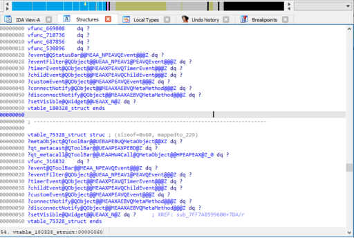 该脚本不需要任何安装,所以要使用它,只需按Alt-F7键并选择Main.py文件。它将在你的数据库中添加大量的断点,然后一旦你使用你选择的调试器后台运行目标应用程序,它将创建C++虚拟表。当然,由于断点的存在,应用程序的执行速度会比平时慢。除了创建虚拟表之外,该脚本还为调用的函数添加了交叉引用。